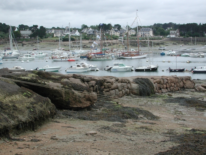 Vue de la cale Padel à marée basse avec ses grorcs blocs de granit posés à secImmatriculation
