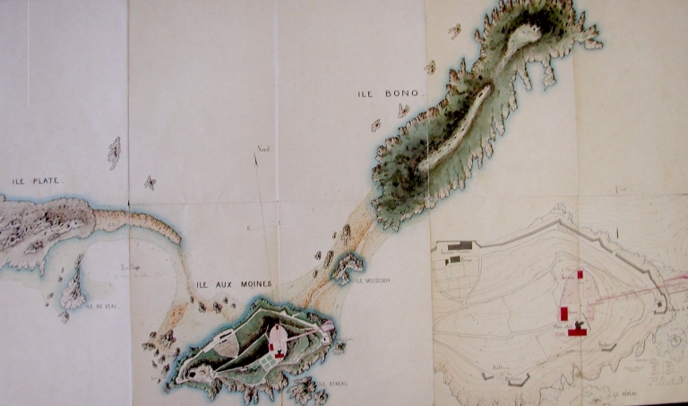 Carte : projet de construction de plusieurs phares entre Rouzic et l'Île-aux-Moines 1883-84 : remarquer le plan du débarcadère à l'est de l'île (AD 22)Immatriculation