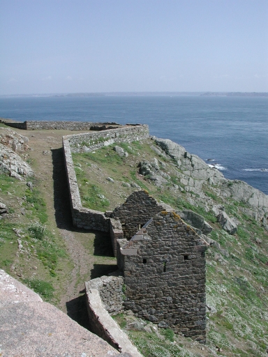Vue générale du site d'approche (en venant de l'ouest) du grand corps de garde de l'Île aux Moines, au sud-est de la redoute : remarquer les murs de defenseImmatriculation