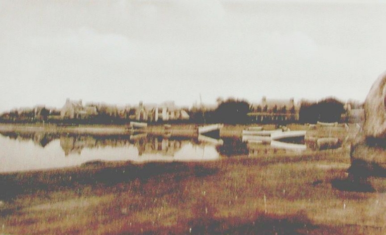 Vue générale de la baie de Sainte-Anne au début du 20e siècle, lieu d'hivernage pour les canots (carte postale, collection particulière)Immatriculation