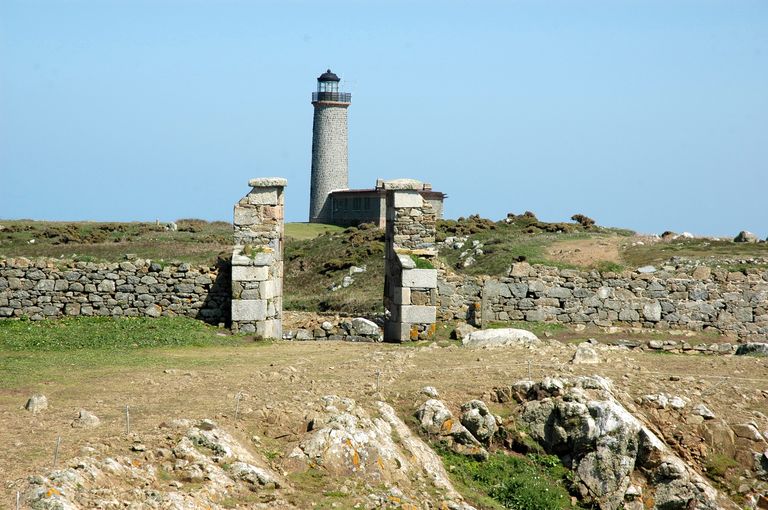 Vue de la porte du fort de l'île aux Moines depuis la terrasse de la redoute. En arrière plan : le phareImmatriculation