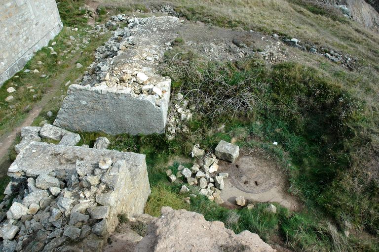 Vue de la batterie de Loqueltas. Emplacement d'une pièce d'artillerie moderne en place lors de la Seconde Guerre Mondiale. Le parapet en maçonnerie est ruinéImmatriculation