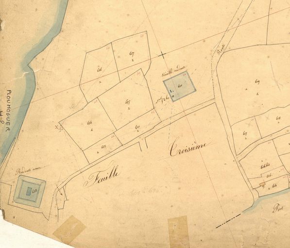Extrait du cadastre parcellaire de la commune de Ploumoguer : Section H2 de Tréfeust, 1840. Du nord au sud se trouvent la Vieille redoute et la Redoute neuveImmatriculation