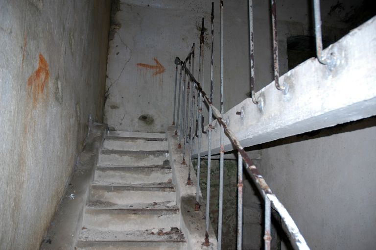 Vue de la caserne défensive Robert : escaliers (béton) desservant l'étageImmatriculation