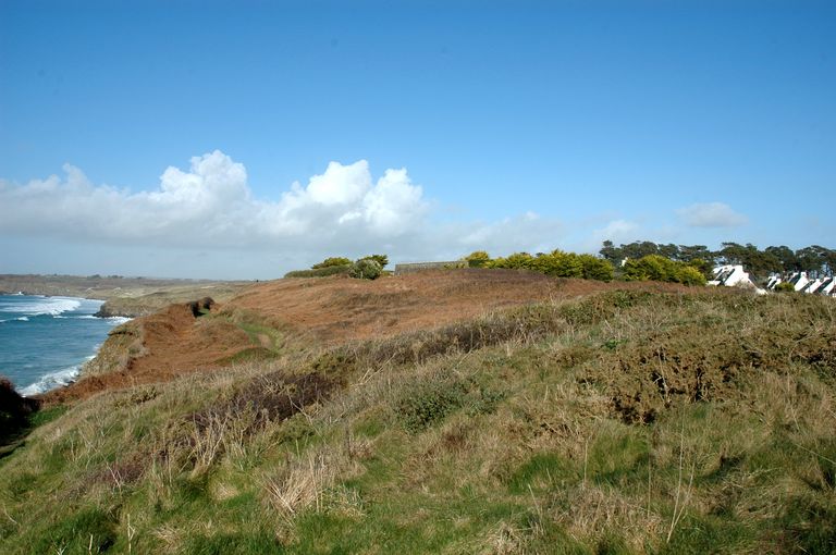 Vue de situation depuis le sentier côtier (état en 2006). Seule la partie sommitale de l'escarpe de la redoute émerge au niveau des arbresImmatriculation
