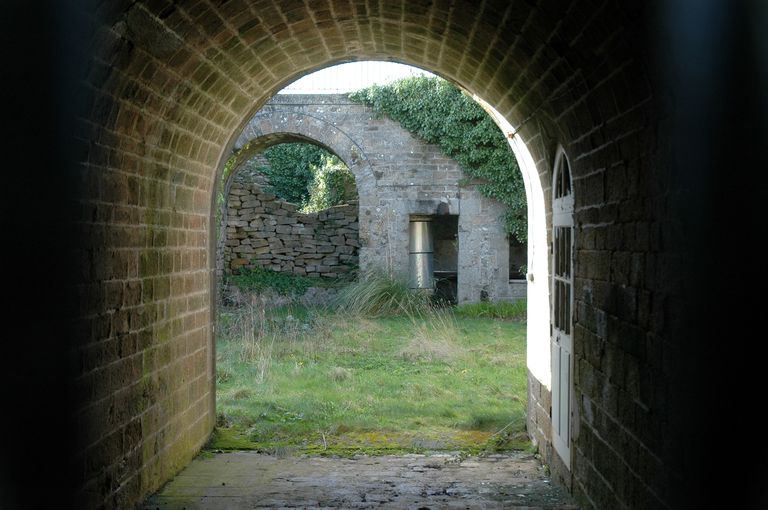 Vue du passage d'entrée voûté en berceau et de la cour intérieure (état en 2006). Dans le passage d'entrée à droite, porte en arc plein cintreImmatriculation