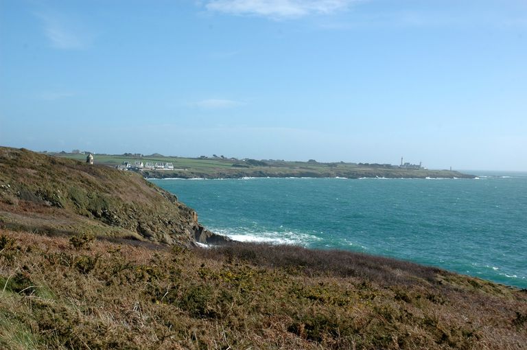 Vue générale de l'ensemble fortifié de Porsfeunteun : batterie de côte et guérite. En arrière-plan : la pointe Saint-MathieuImmatriculation
