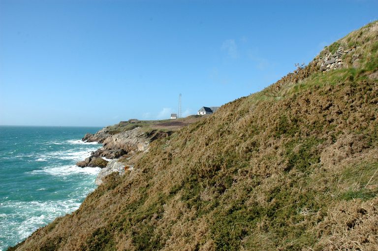 Vue de l'ensemble fortifié de Porsfeunteun : batterie de côte. En arrière-plan : la pointe du RenardImmatriculation