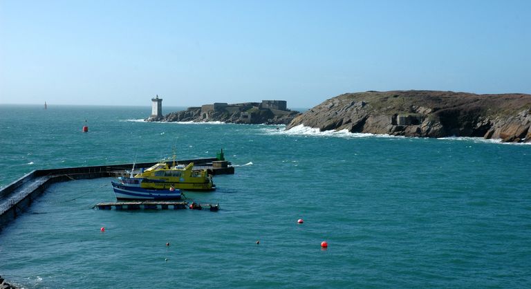 Vue de l'entrée du port du Conquet. En arrière-plan : l'ensemble fortifié de la pointe de Kermorvan et son phareImmatriculation