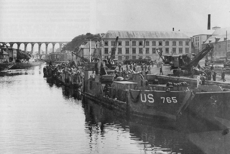 Vue du port de Morlaix : ravitaillement des troupes américaines avant la bataille de Brest, août 1944. En arrière-plan : la manufacture de tabacImmatriculation