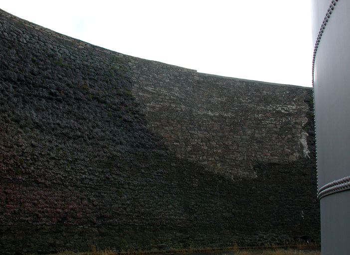 Vue du parc à carburant de Maison Blanche : encuvement en moellon et cuve métallique (à droite)Immatriculation