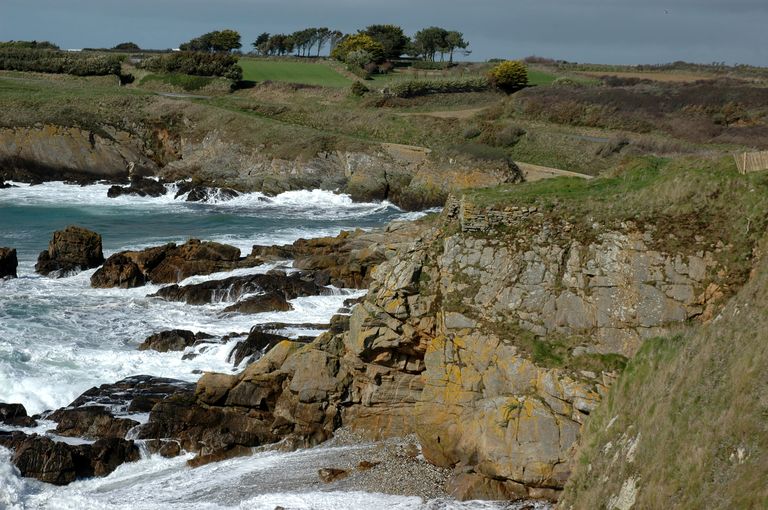 Vue de la micro-falaise entre les pointes de Saint-Mathieu et de Penzer : elles ont été aménagées par la construction de muret de pierres sèches afin de faciliter la récolte du goémonImmatriculation
