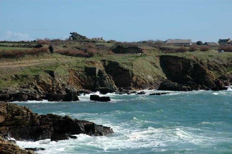 Vue de la micro-falaise entre les pointes de Saint-Mathieu et de Penzer : elles ont été aménagées par la construction de muret de pierres sèches afin de faciliter la récolte du goémonImmatriculation