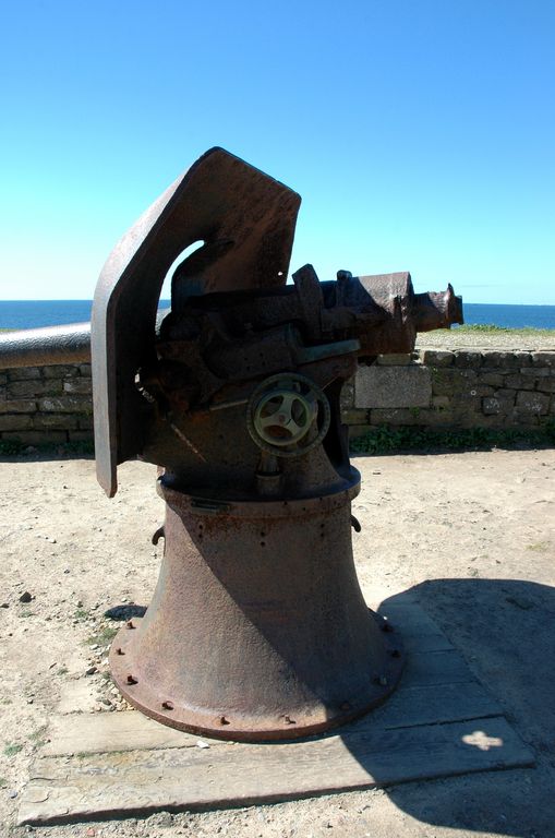 Vue de détail de l'un des deux canons de 95 mm Lahitolle modèle 1888 sur leur affût avec masqueImmatriculation