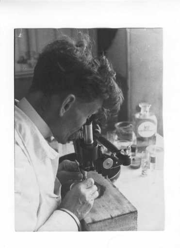 Charles Pérez se livrant à une observation à la loupe binolulaire. PhotographieImmatriculation