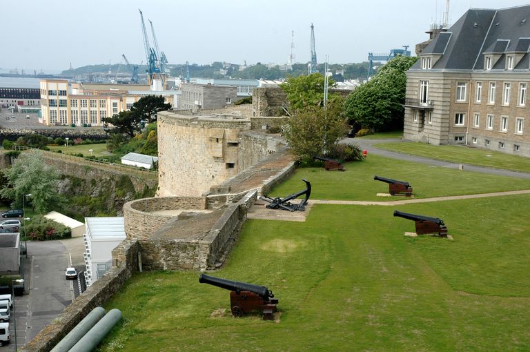 Vue générale : tour du Moulin, tour Française et préfecture maritime. En arrière-plan : l'arsenal et le goulet de BrestImmatriculation