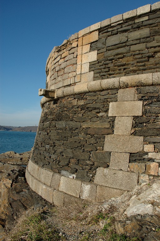 Vue de détail de l'escarpe et du parapet (état en 2005). Marquant la jonction entre l'escarpe et le parapet, le cordon en granite gris. L'embrasure est bouchéeImmatriculation