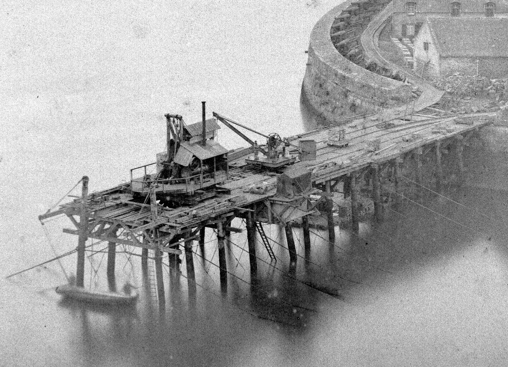 Vue du fort du Mengant en 1877 : chantier de construction du môle des torpilleursImmatriculation