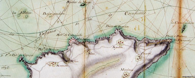 Carte du goulet de Brest, fait à Brest le 15 juillet 1695 par Vauban. A.-B. : étendue de la passe sous le feu des batteries de 5200 toises ou deux bonnes lieues. Service Historique de la Défense, Château de VincennesImmatriculation