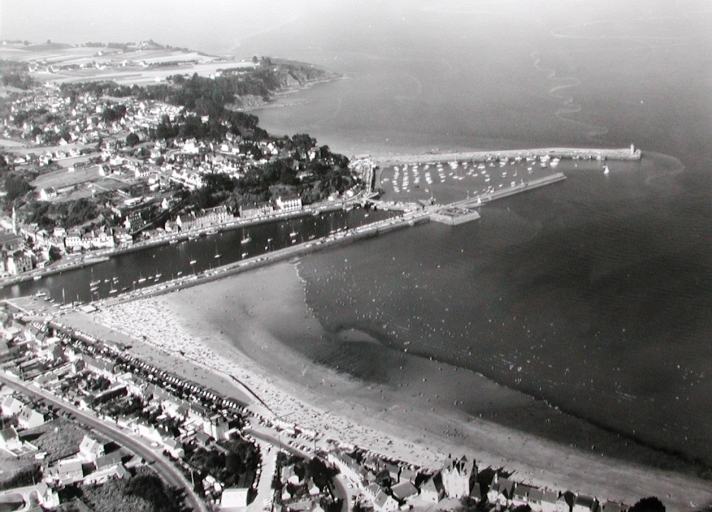 Vue aérienne du port de Binic en 1954 : la Banche, le bassin à flot, l'avant-port et la plage ouest (Fonds Henrard AD 22)Immatriculation