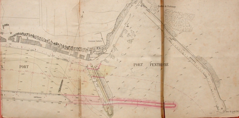 Plan daté de 1894 : prolongement de l'estacade, digue de protection de l'avant-port, coupure dans la vieille jetée et musoir (AD 22)Immatriculation