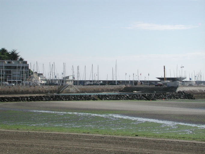 Vue du quai de Pordic depuis la Banche à marée basse : remarquer la piscine et les aménagements du terre-pleinImmatriculation