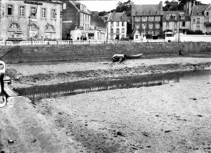 Vue du quai Jean Bart dans le prolongement du quai de Courcy à marée basse : remarquer le doris dans la grève, 1950 (AD 22)Immatriculation