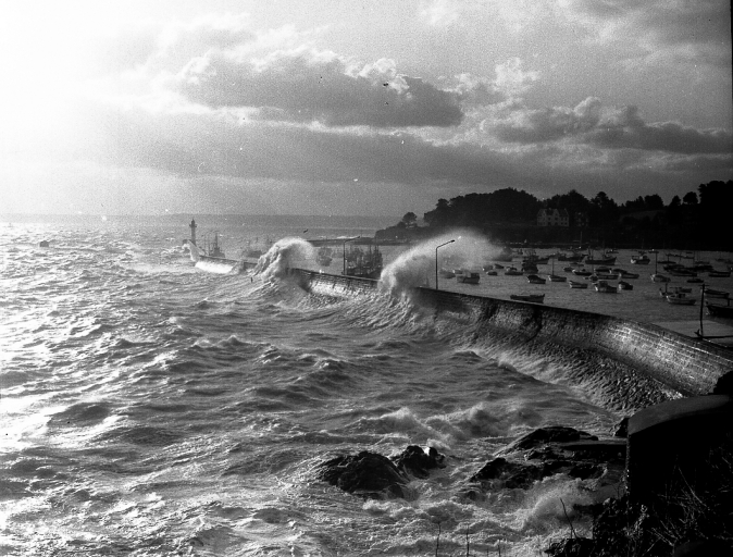 Le môle de Penthièvre et l'avant-port, un jour de tempête : remarquer les enrochements devant le mur du quai (AD 22, Fonds Joël)Immatriculation