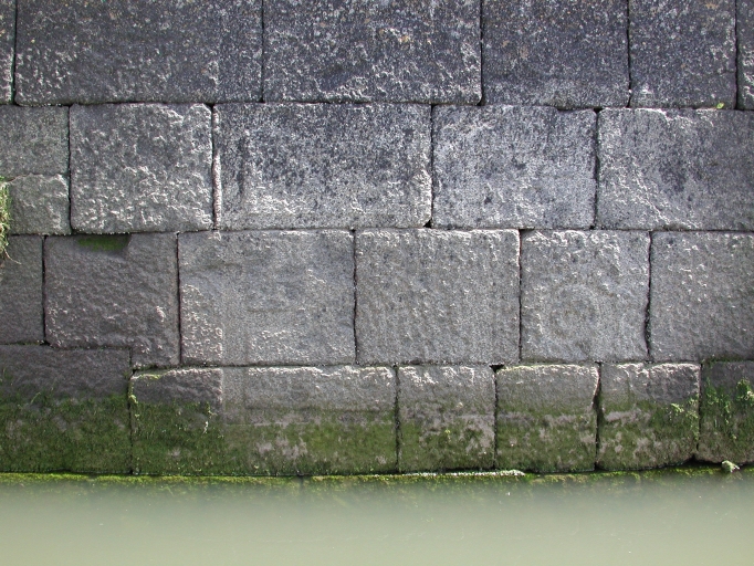 Vue de l'échelle à marée gravé dans le mur de quai : remarquer le chiffre 6 et le dessin inscrits dans le mur du quaiImmatriculation