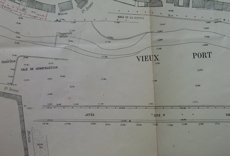 Plan général du vieux port de Binic en 1895 : remarquer la passerelle mobile et la cale de la Cloche (AD 22)Immatriculation