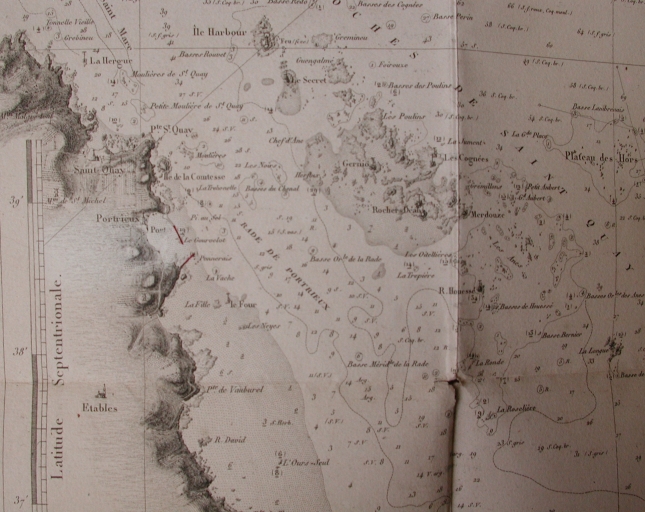 Extrait du plan général de la baie de Saint-Brieuc, relevé par Beautemps Beaupré en 1837 : le projet de jetées est indiqué (AD 22)Immatriculation