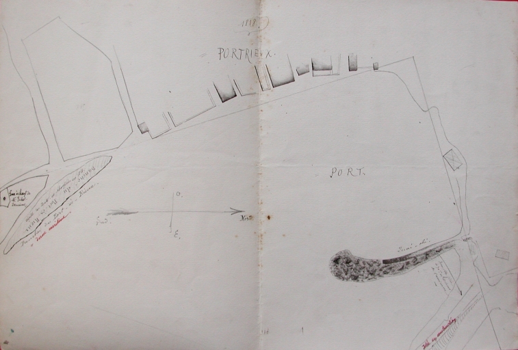 Plan du Portrieux en 1818 : remarquer la vieille chaussée, la Banche de Pors Es Rieux et le four à chaux (AD 22)Immatriculation