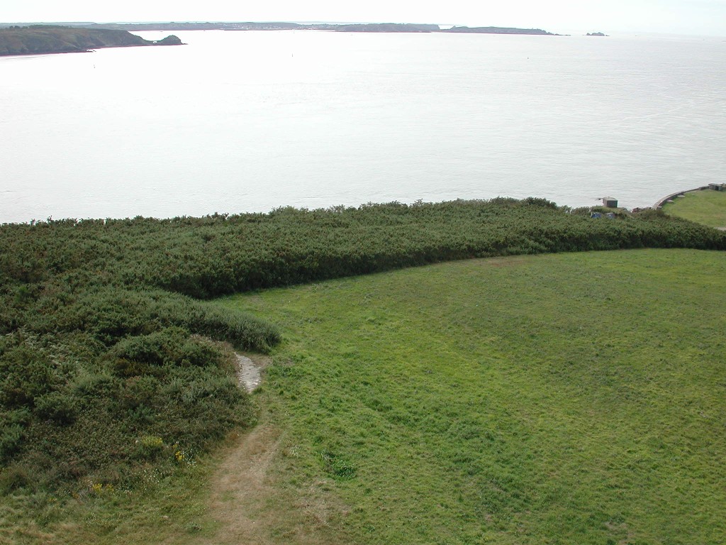 Vue de situation du poste de télémétrie de la batterie d'artillerie de 32 cm du Mengant depuis la tour de mesures de Kerdalaez (état en 2002). Au premier-plan à gauche, cuve pour canon antiaérien de 10,5 cmImmatriculation