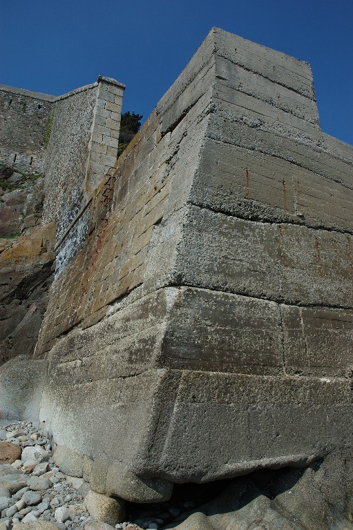 Vue de l'extrémité ouest de la batterie basse du Mengant depuis la grève à marée basse : partie consolidée en béton armé (état en 2005). Au-dessus, la branche tombante ouest percée de créneaux de tirImmatriculation
