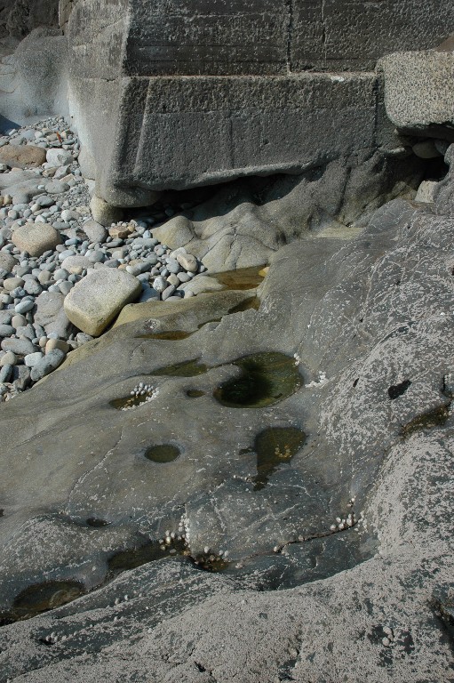 Vue de l'emplacement des fondations de la batterie basse sur la grève à marée basse (état en 2005). En arrière-plan, la partie consolidée en béton arméImmatriculation