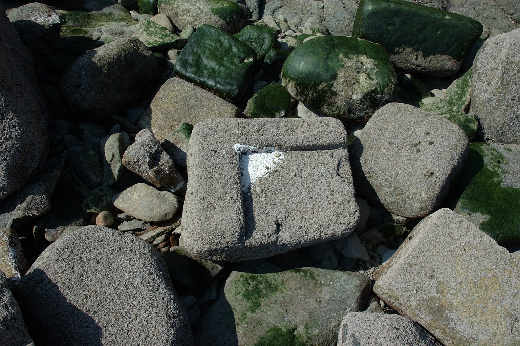 Vue d'une partie d'un bloc de fondation de dé sous-sellette (pour canon de 30 livres ou obusier de 22 cm) de la batterie basse sur la grève à marée basse (état en 2005)Immatriculation