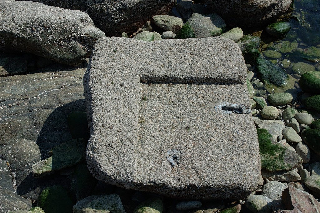 Vue d'une partie d'un bloc de fondation de dé sous-sellette (pour canon de 30 livres ou obusier de 22 cm) de la batterie basse sur la grève à marée basse (état en 2005)Immatriculation