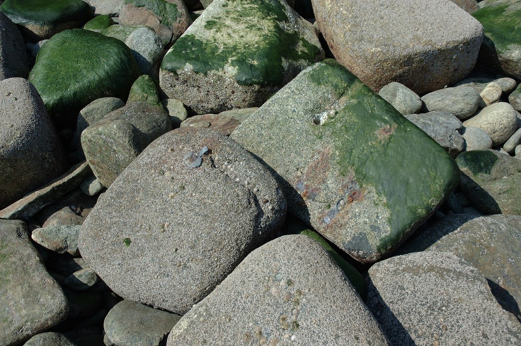 Vue de pierres de taille de granite du parement de la batterie basse sur la grève à marée basse (état en 2005). Les pierres étaient à l'origine cramponnées entre elles par des plaques métalliquesImmatriculation