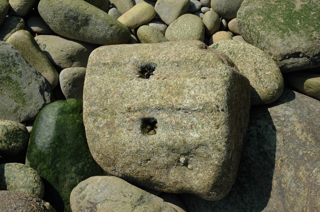 Vue dune pierre de taille de granite du parement de la batterie basse sur la grève à marée basse (état en 2005). Les pierres étaient à l'origine cramponnées entre elles par des plaques métalliquesImmatriculation