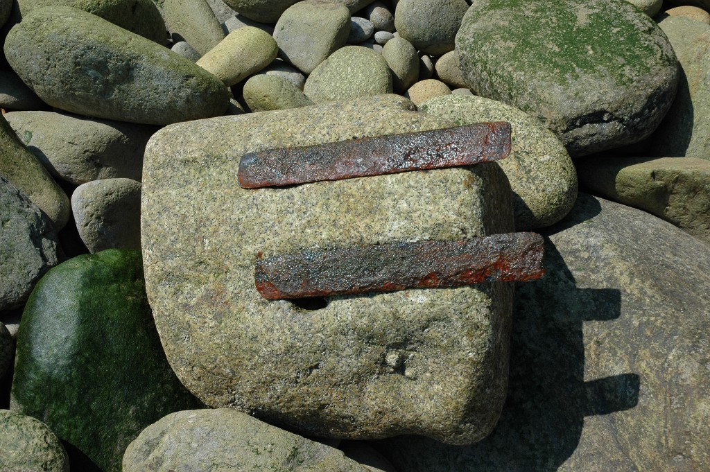 Vue dune pierre de taille de granite du parement de la batterie basse sur la grève à marée basse (état en 2005). Les pierres étaient à l'origine cramponnées entre elles par des plaques métalliques.Immatriculation