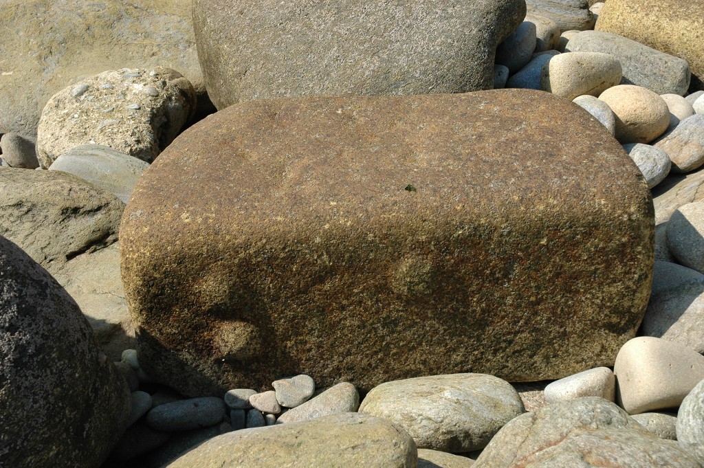 Vue dune pierre de taille de granite du parement de la batterie basse sur la grève à marée basse (état en 2005)Immatriculation