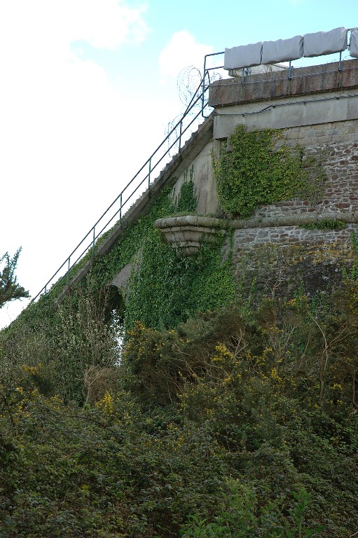 Vue de la partie haute du fort du Mengant : angle nord-est, vestiges d'un cul de lampe d'échauguette et rampe-funiculaire du bâtiment de la base d'essais de radiodétection (état en 2005)Immatriculation