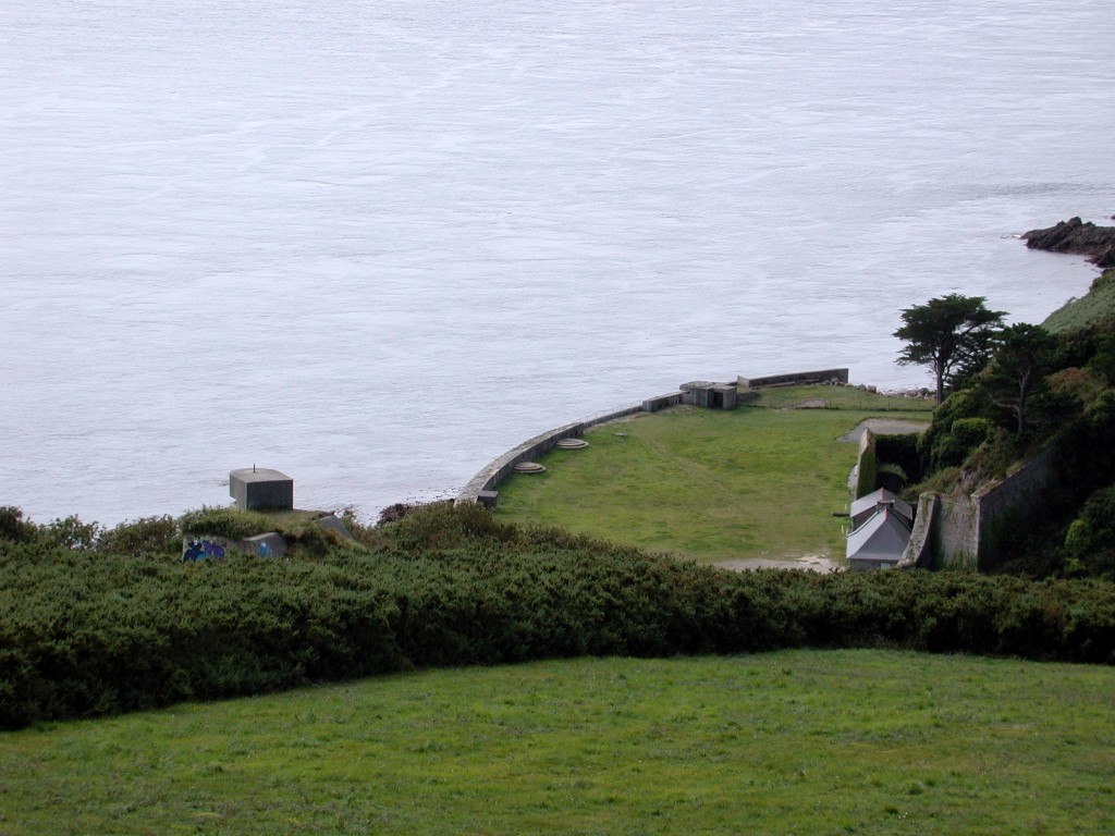 Vue de situation du poste d'observation et de télémétrie n° 1 (état en 2003). Au ras de la mer, la batterie basse du Mengant depuis KerdalaezImmatriculation