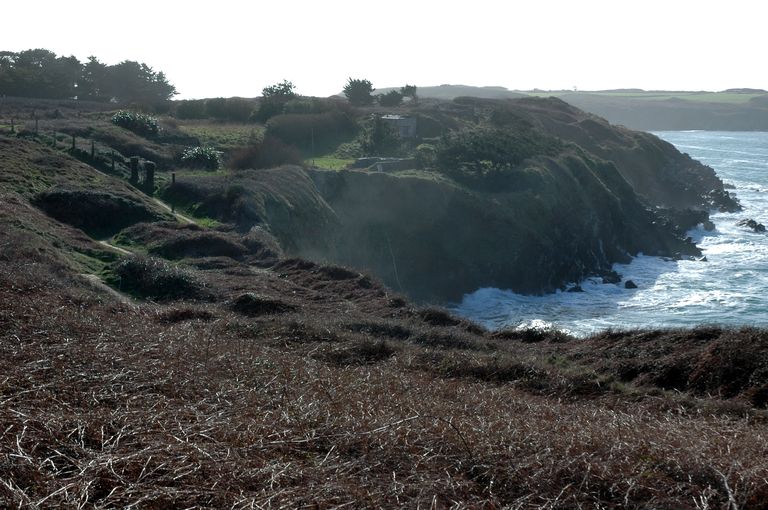 Vue de l'extrémité sud-ouest de la plage des Blancs Sablons : vestiges de la batterie de Treize et bunkersImmatriculation