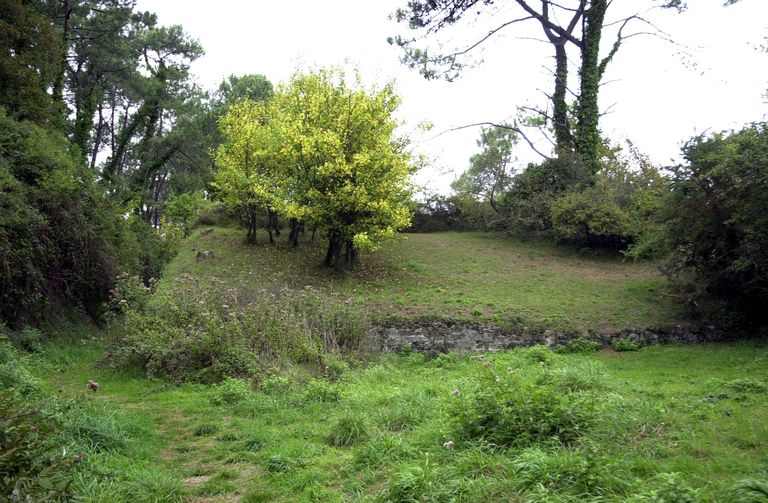 Vue du corps de garde crénélé n° 2 modifié de la pointe de Morgat ou Kador : masque terrassé couvrant le long pan est et le pignon sud. Masque artificiel réalisé avec le déblai provenant de la fouilleImmatriculation