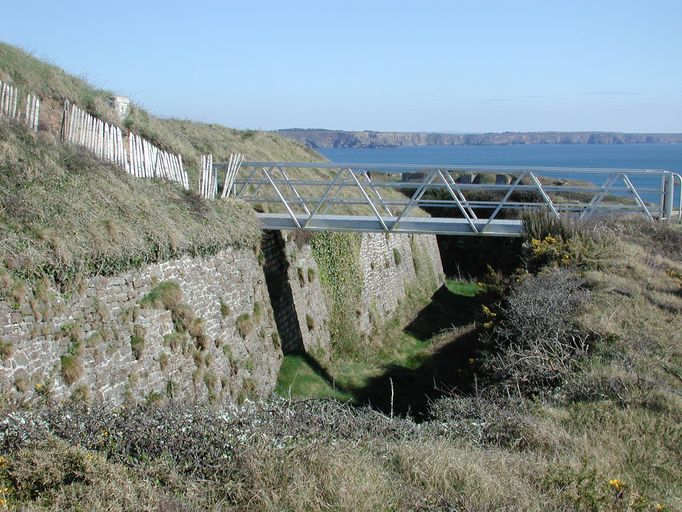 Vue du fossé sec au sud-ouest (état en 2007). La passerelle permet de traverser le réduitImmatriculation