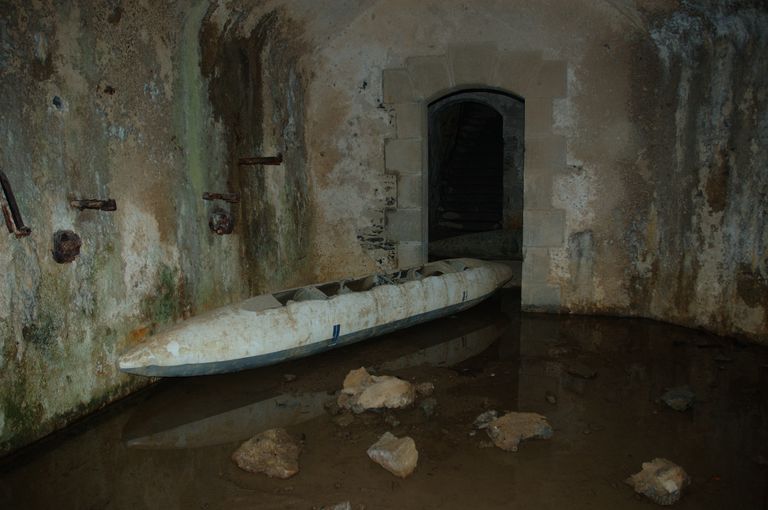 Vue du couloir de circulation (état en 2007). Au sol, torpille inerte ayant servi à un exercice militaireImmatriculation