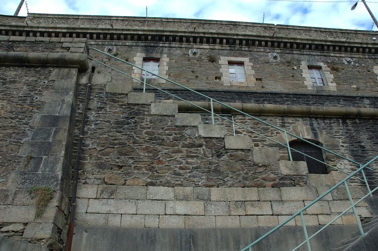 Vue de l'escalier d'accès aux latrines (soubassement en pierre de taille de granite)Immatriculation