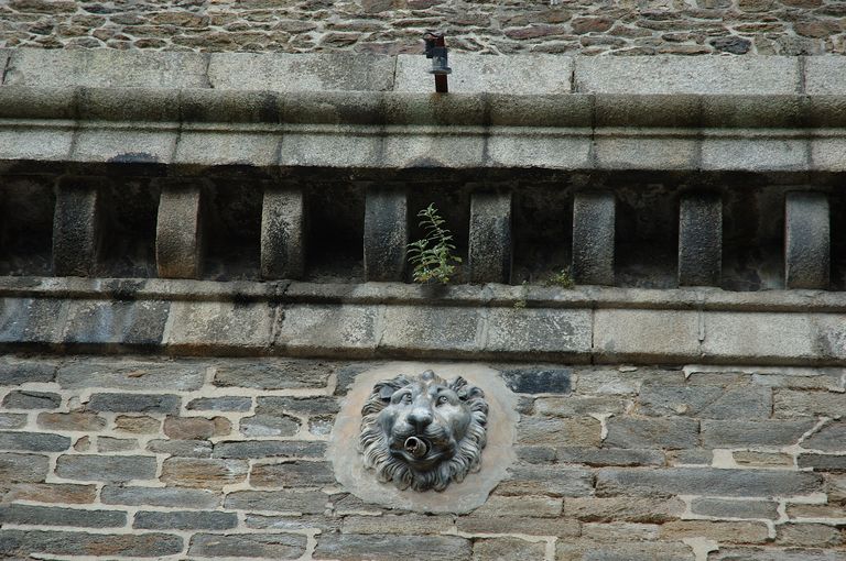 Détail de la façade orientale : l'une des dix gargouilles ornées de tête de lion et cornicheImmatriculation