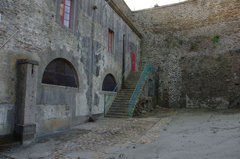 Vue de l'élévation occidentale : escalier extérieur sud donnant accès au premier étage. A droite, mur doté de contreforts donnant côté prison de PontaniouImmatriculation